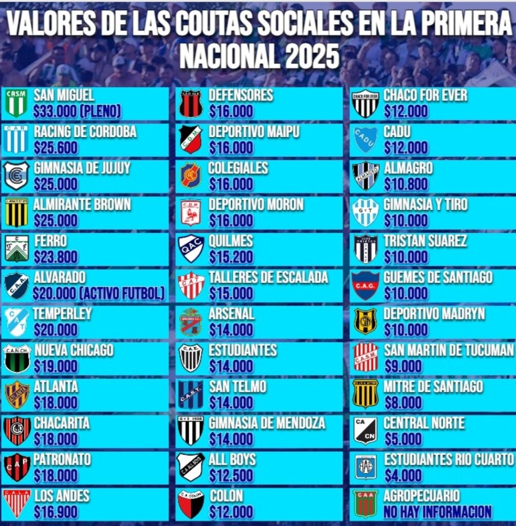 La cuota más costosa de la categoría es la de San Miguel, con 33.000 pesos, mientras que la de menor valor es de 4.000 pesos. En tanto que no fue reportada la de Agropecuario no fue informada. La del Sabalero, en tanto, es de 12.000 pesos, a la altura de las de Chaco For Ever y Defensores Unidos de Zárate.