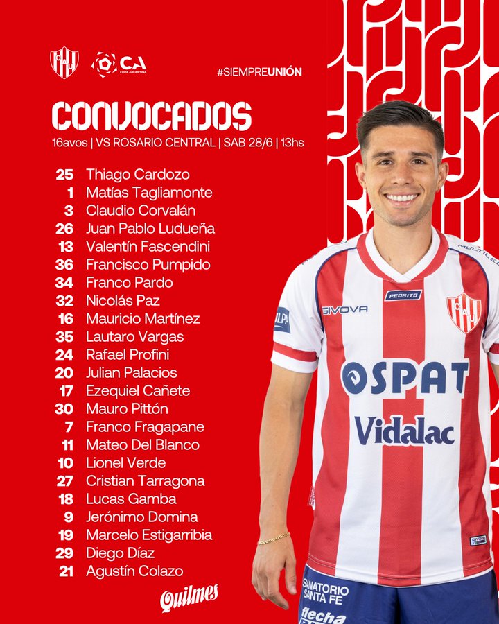 En la noche de este viernes se conoció la lista de convocados de Unión para el duelo ante Rosario Central, correspondiente a los 16avos de final de la Copa Argentina.