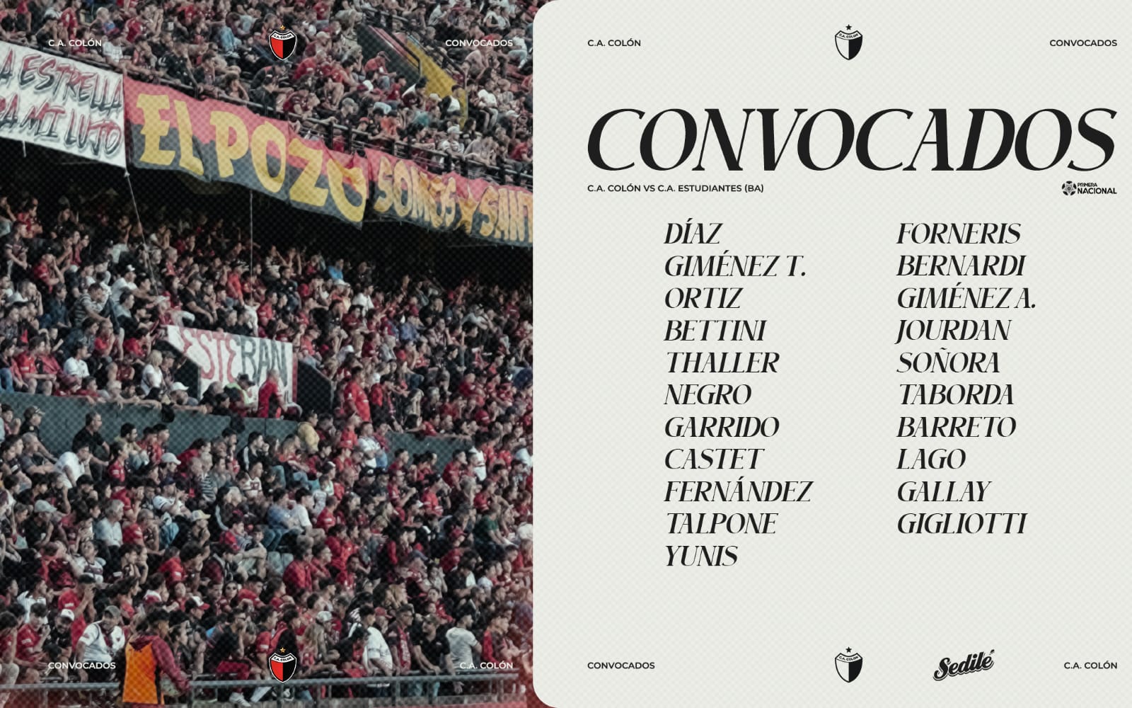 Colón dio a conocer este viernes la lista de futbolistas concentrados para el partido ante Estudiantes de Caseros por la fecha 16 de la Primera Nacional, que se disputará este sábado desde las 15 en el Brigadier López.
