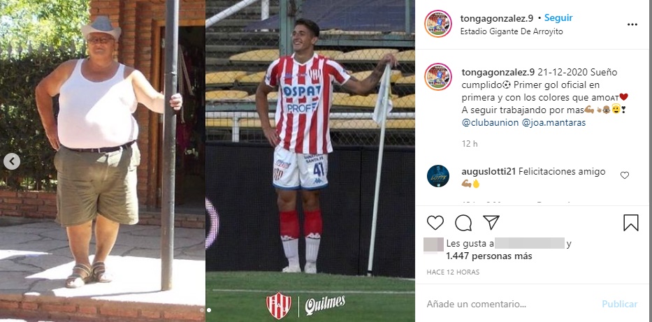 González fue corriendo al banderín del córner y realizó un festejo que pocos entendieron. Más tarde explicó en sus redes sociales el porqué de dicho festejo. Es que hace pocos meses falleció su abuelo y Gastón imitó una de sus poses para homenajearlo. “21-12-2020 Sueño cumplido⚽️ Primer gol oficial en primera y con los colores que amo🇦🇹❤️ A seguir trabajando por mas💪🏽 ☝🏽”, escribió Gastón González en su cuenta de Instagram