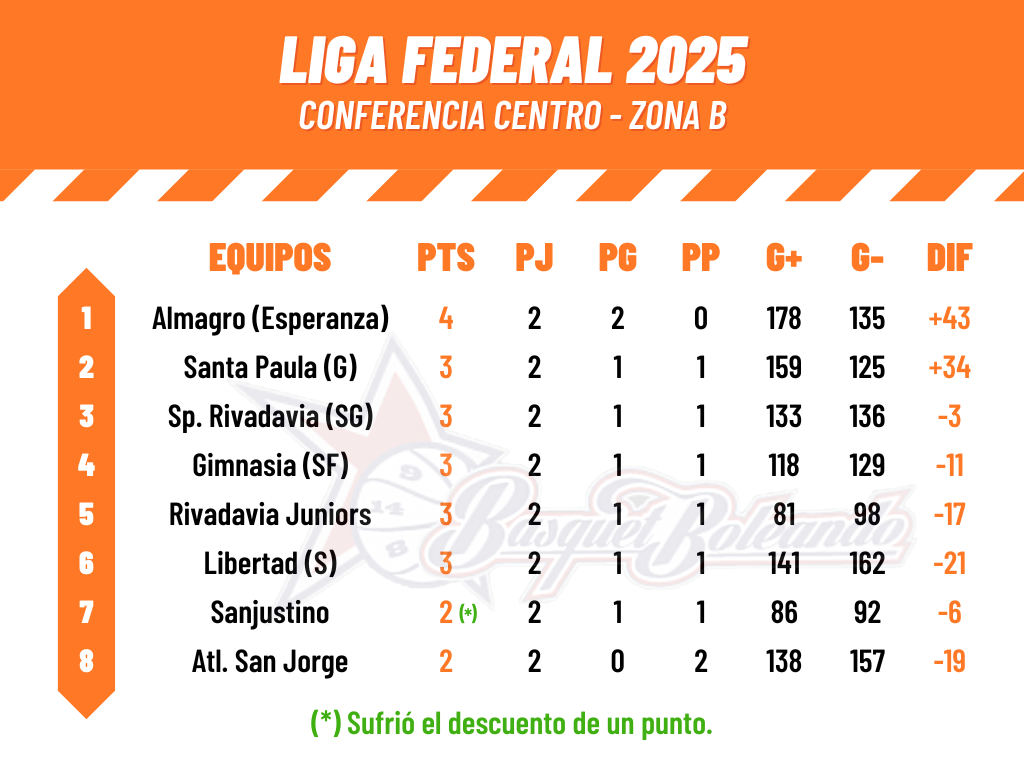 En su segunda presentación por La Liga Federal 2025, Gimnasia y Esgrima de Santa Fe perdió ante Sportivo Rivadavia por 68 a 54. El pleito lo tuvo al conjunto anfitrión como dominador en los primeros diez minutos con Paglietta y Mendia como destacados. Los pupilos de Ciprian lograron emparejar el tramite en el segundo cuarto, pero su rival encontró la manera de mantenerse arriba en el tanteador para irse al descanso largo en ventaja por 42 a 33. Tras el paso por vestuario, el juego se tornó poco vistoso y con un bajo goleo notable. Tal es así, que los de la Capital santafesina lo ganaron solo por 8 a 6. El cuarto final, volvió a mostrar al equipo de San Genaro con mejores acciones que le permitieron escaparse definitivamente en el tanteador. Los mensanas equivocaron los caminos y anotaron a cuenta gotas. El elenco de Bogado se llevó la victoria por 68 a 54 y cosechó su primera alegría. En la próxima, Sportivo Rivadavia sale a la ruta por primera vez en el torneo para medirse ante Rivadavia Juniors, mientras que, GYE en duelo ASB recibe a Almagro de Esperanza.