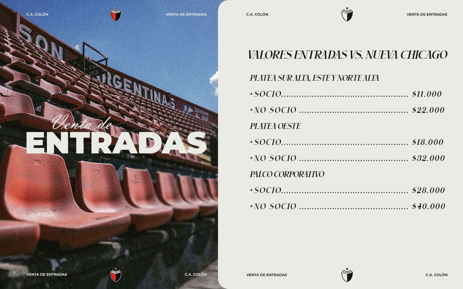 – Palco Corporativo: Socio $28.000 / No socio $40.000
